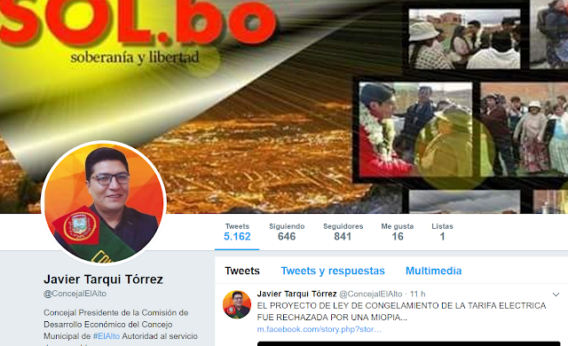 Los concejales de la ciudad de El Alto que tienen presencia en Twitter son Javier Tarqui, de Soberanía y Libertad (@concejalelalto); Nancy Mamani (@Kullakita_Nancy) y Juanito Angulo (@juanitoanguloh), del Movimiento Al Socialismo (MAS).